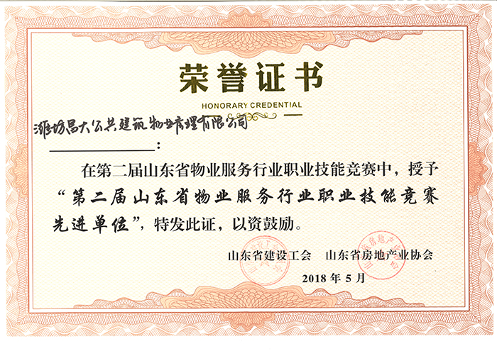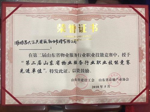 2018年5月被評(píng)為第二屆山東省物業(yè)服務(wù)行業(yè)職業(yè)技能競(jìng)賽現(xiàn)進(jìn)單位