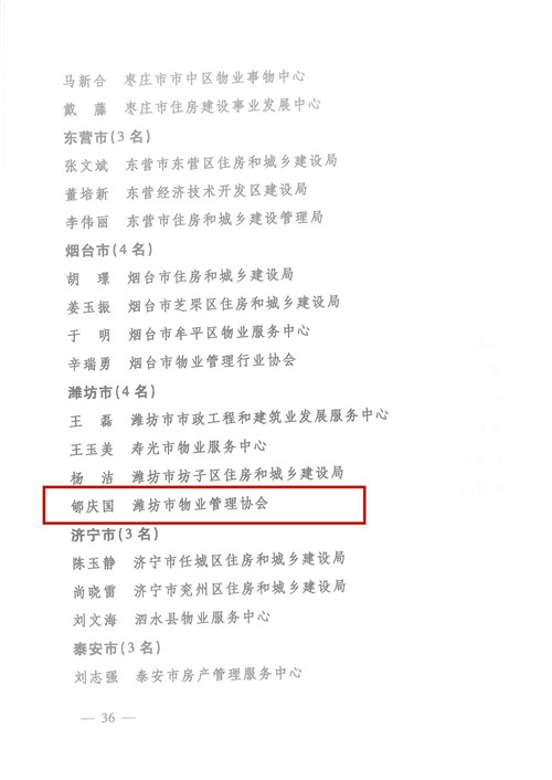 2019年,山東省住房和城鄉(xiāng)建設廳開展了物業(yè)服務行業(yè)文明創(chuàng)建“標準建設年”活動,為表揚鼓勵先進,發(fā)揮示范引領作用,激發(fā)創(chuàng)建工作熱情,經(jīng)逐級申報、審核、公示等程序,公管公司獲得以下省級榮譽:濰坊昌大公共建筑物業(yè)管理有限公司榮獲“全省物業(yè)服務行業(yè)文明創(chuàng)建標兵企業(yè)”榮譽稱號;總經(jīng)理郇慶國兼濰坊市物業(yè)協(xié)會會長榮 ......