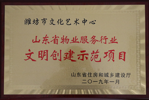 公司被省住房和城鄉(xiāng)建設廳授予“山東省物業(yè)服務行業(yè)文明創(chuàng)建標兵企業(yè)”稱號,濰坊市文化藝術中心物業(yè)管理項目被評為“山東省物業(yè)服務行業(yè)文明創(chuàng)建示范項目”。